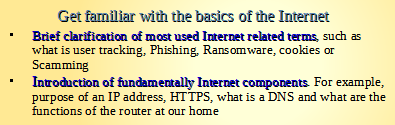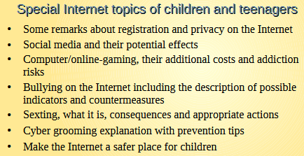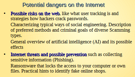 Several trainings are offered, where you get essential knowledge about the Internet and possible dangers. Frequently occurring threats and possible countermeasures are explained. Further topics like social media, cyber bullying, or online games, are discussed in a course particularly targeted for people with children. |